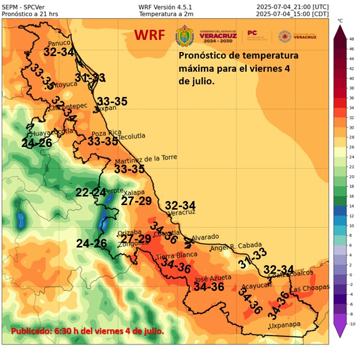 Las máximas de 30 a 35 °C en Zacatecas, San Luis Potosí, Guanajuato (noreste), Querétaro (norte), Hidalgo (norte y oriente), Puebla (norte y suroeste) y Veracruz (costa y sur).