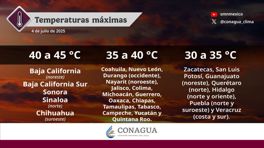 Las temperaturas máximas irán de 40 a 45 °C en Baja California (noreste), Baja California Sur, Sonora, Sinaloa (norte) y Chihuahua (suroeste).