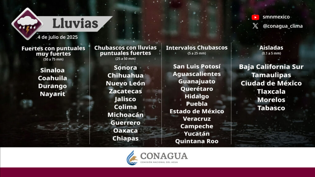 También, informa la CONAGUA, lluvias puntuales fuertes en Sonora y Chihuahua, todas acompañadas con descargas eléctricas; y lluvias aisladas en zonas de Baja California Sur.
