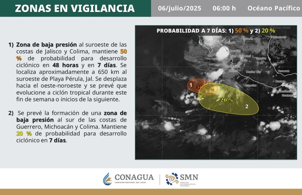 Indica que una zona de baja presión con probabilidad para desarrollo ciclónico se desplazará al suroeste de las costas de Jalisco, sin afectar a costas nacionales.