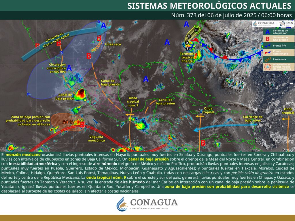 Añade que el avance de la onda tropical número 9 sobre el sureste y sur del país, generará lluvias puntuales muy fuertes en Chiapas y Oaxaca; y puntuales fuertes en Tabasco y Veracruz.