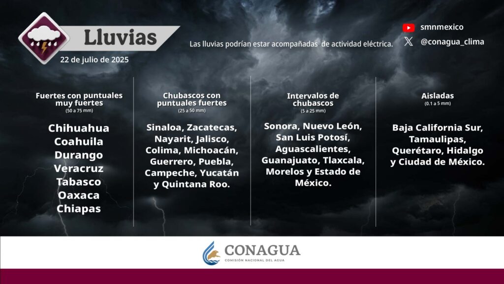 También, informa la CONAGUA, lluvias puntuales fuertes en Nayarit y Sinaloa, intervalos de chubascos en Sonora y lluvias aisladas en zonas de Baja California Sur.