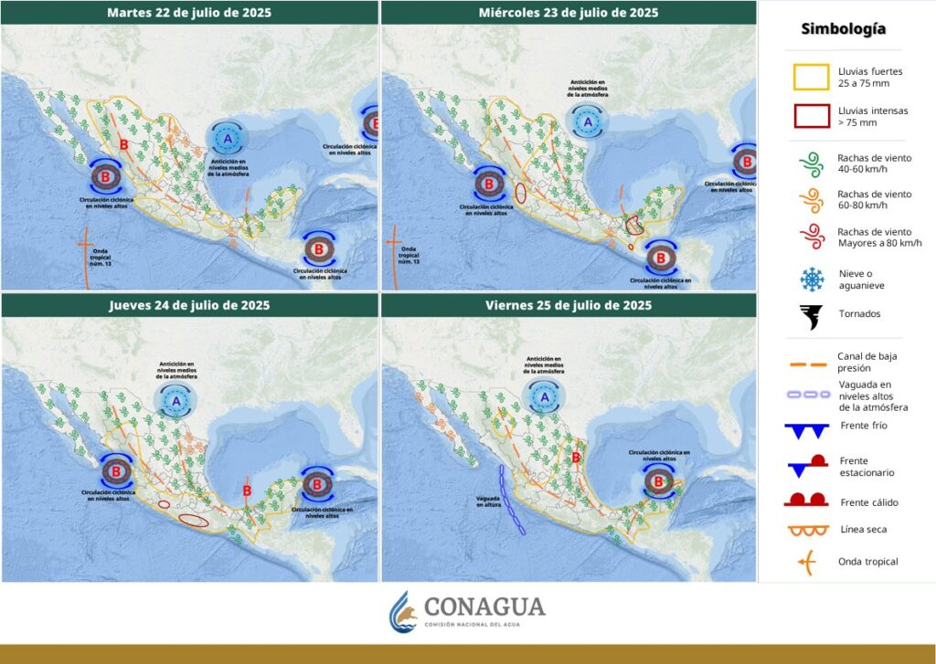 Dichos sistemas originarán lluvias puntuales muy fuertes en Tabasco, Veracruz, Chiapas y Oaxaca, así como lluvias puntuales fuertes en Quintana Roo, Yucatán y Campeche.