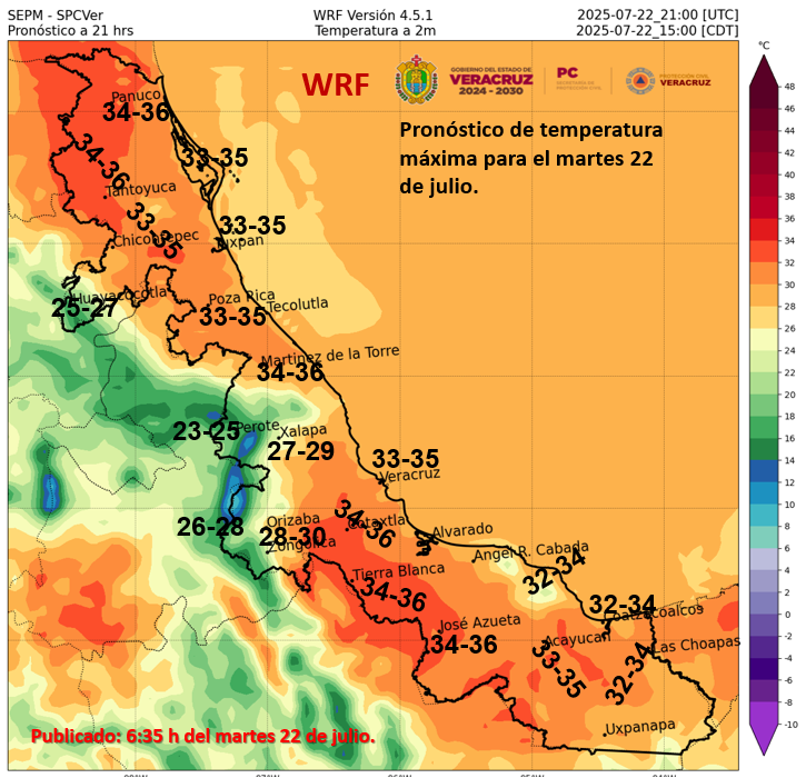 Las máximas de 35 a 40 °C en Sonora, Coahuila, Durango, Nayarit, Jalisco, Colima, Michoacán, Guerrero, Oaxaca, Chiapas, Tamaulipas, Veracruz (norte), Tabasco, Campeche, Yucatán y Quintana Roo.
