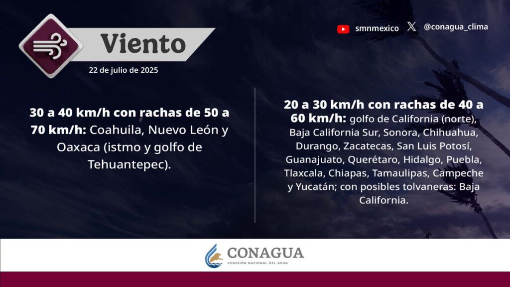 Viento de 20 a 30 km/h con rachas de 40 a 60 km/h en el golfo de California (norte), Baja California Sur, Sonora, Chihuahua, Durango, Zacatecas, San Luis Potosí, Guanajuato, Querétaro, Hidalgo, Puebla, Tlaxcala, Chiapas, Tamaulipas, Campeche y Yucatán.