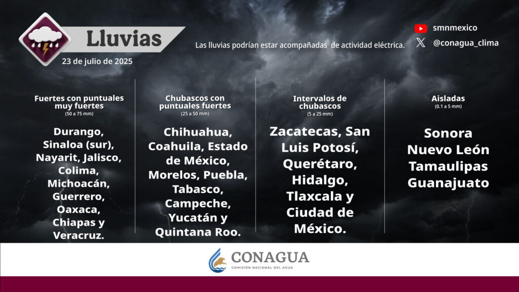 Lo anterior ocasionará chubascos con lluvias puntuales fuertes en dichas regiones; además de lluvias puntuales muy fuertes en Jalisco, Colima, Michoacán, Veracruz y Guerrero.