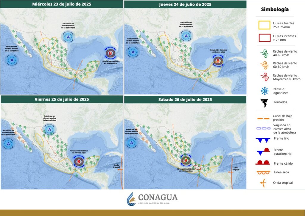 Dichos sistemas propiciarán lluvias fuertes a muy fuertes en Chihuahua, Durango, Sinaloa (sur) y Nayarit, así como lluvias aisladas en Sonora.