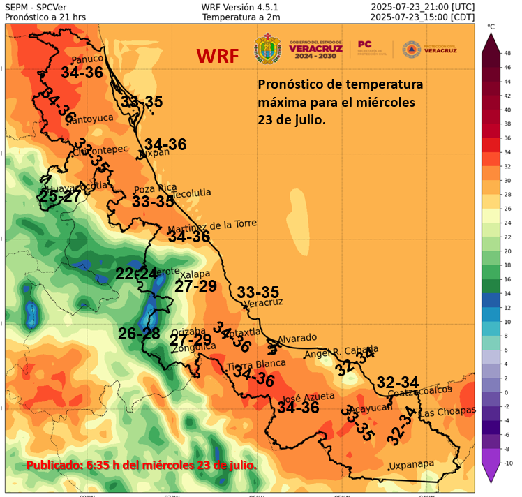 Las máximas de 35 a 40 °C en Coahuila, Nuevo León, Tamaulipas, Durango, Nayarit, Jalisco, Colima, Michoacán, Guerrero, Oaxaca, Chiapas, Veracruz, Tabasco, Campeche, Yucatán y Quintana Roo.