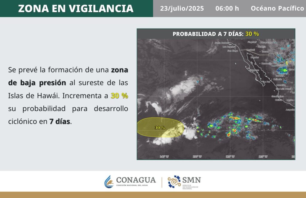 Anuncia canales de baja presión en la Mesa del Norte, oriente y occidente del país; aunado a inestabilidad atmosférica y al ingreso de humedad del océano Pacífico y golfo de México.