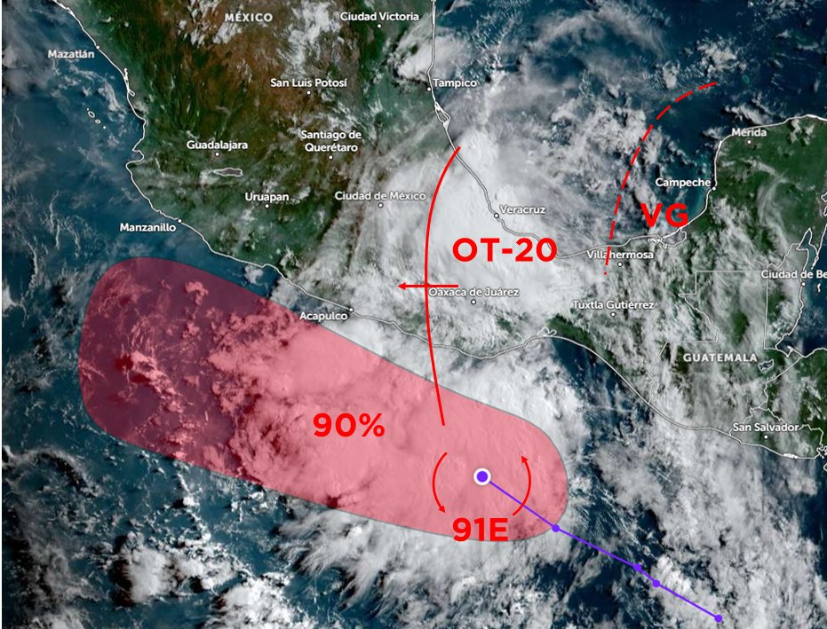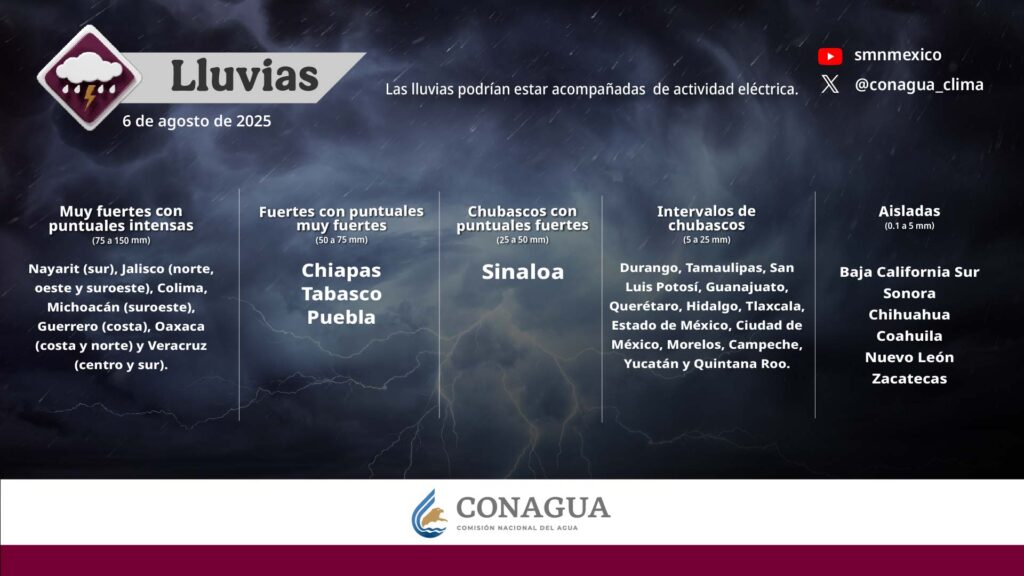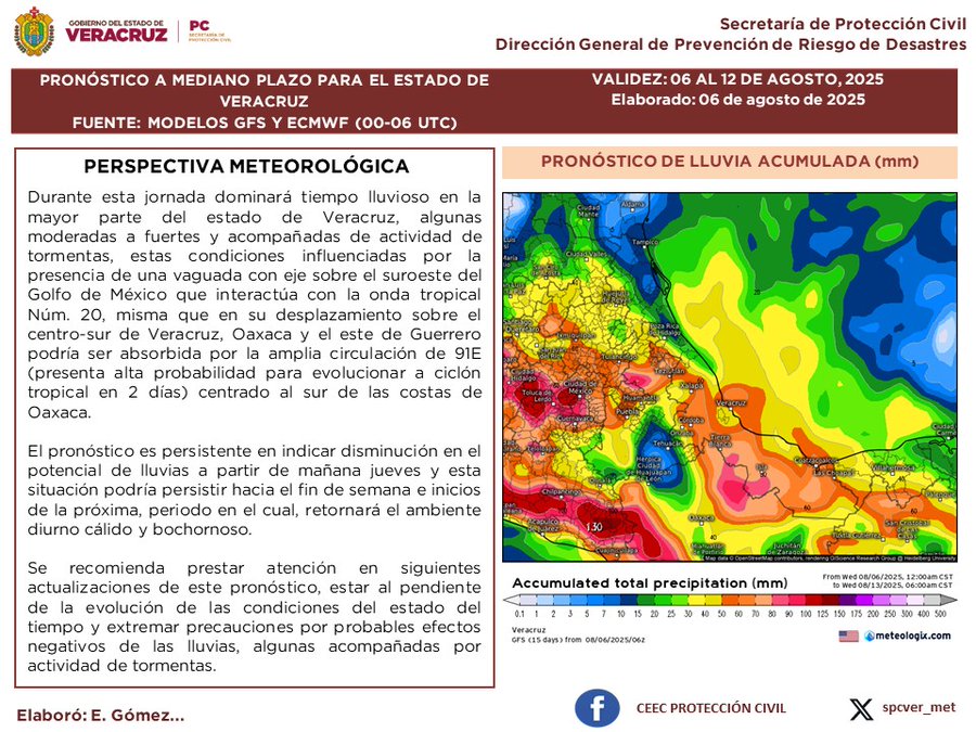 En las próximas 24 horas se esperan condiciones para lluvias y tormentas aisladas moderadas a fuertes con los acumulados más altos en las altas montañas, costa y llanuras del centro y zona sur. La intensidad del calor disminuye ligeramente en comparación al día de ayer con viento dominante del Norte, Noreste, Este y Sureste de 20 a 35 km/h en la costa con rachas en áreas de tormenta. Se recomienda tomar las precauciones por probabilidad de ocurrencia de: deslaves, derrumbes, deslizamientos, destechamientos, caída de árboles u otros objetos, así como por inundaciones o encharcamientos y vigilar ríos y arroyos de respuesta rápida.