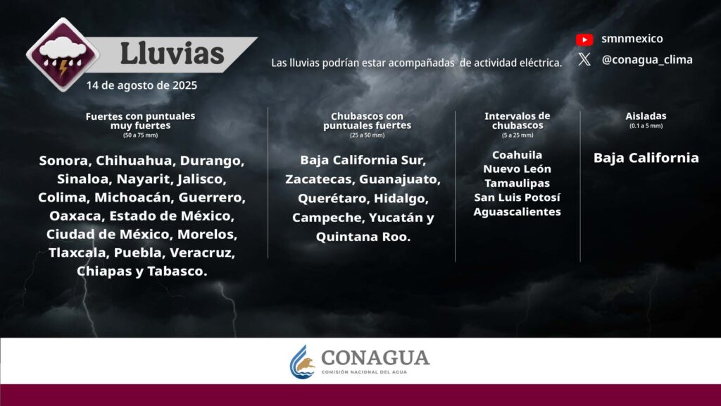 Pronostica lluvias fuertes a puntuales muy fuertes (de 50 a 75 mm) en Sonora, Chihuahua, Durango, Sinaloa, Nayarit, Jalisco, Colima, Michoacán, Guerrero, Oaxaca, EdoMéx, CdMx, Morelos, Tlaxcala, Puebla, Veracruz, Chiapas y Tabasco.