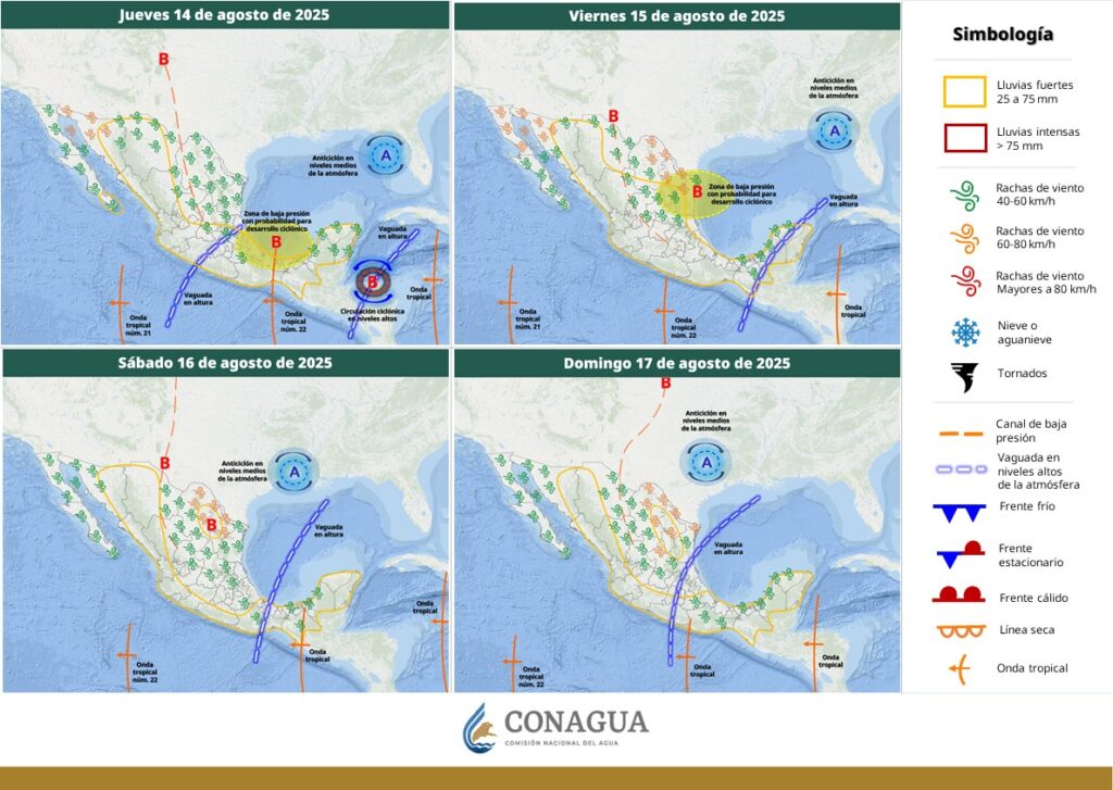 Por otra parte, la CONAGUA espera un canal de baja presión sobre la Mesa del Norte y la Mesa Central, en interacción con una vaguada en altura y con el ingreso de humedad del océano Pacífico y golfo de México.