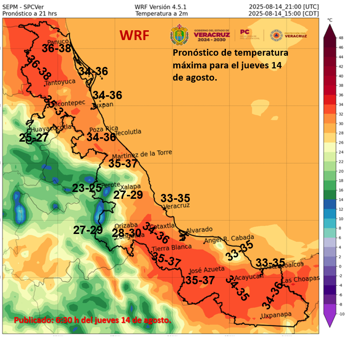 Las máximas de 35 a 40 °C en Durango, Nayarit, Oaxaca, Chiapas, Tabasco, Campeche y Yucatán.