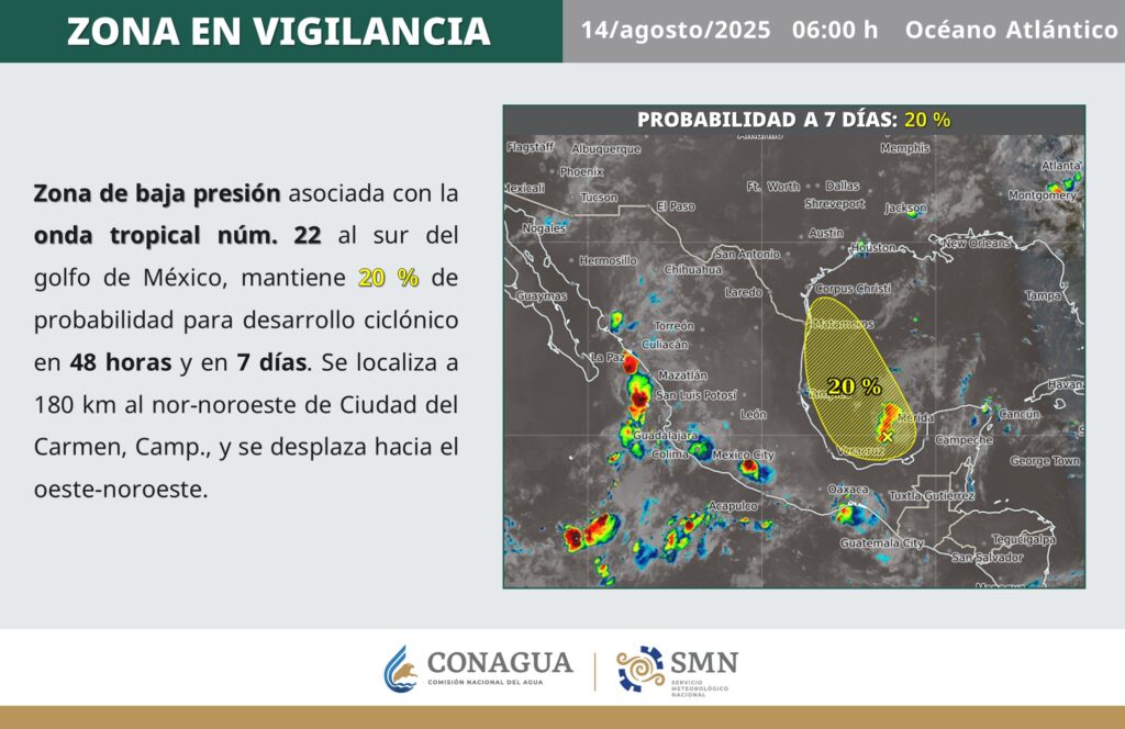 Simultáneamente, añade, la onda tropical número 22, se desplazará sobre el sureste y oriente del país, continuará asociada con una zona de baja presión con probabilidad para desarrollo ciclónico.