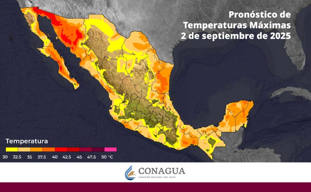 Las temperaturas máximas irían de 40 a 45 °C en Baja California (noreste) y Sonora.