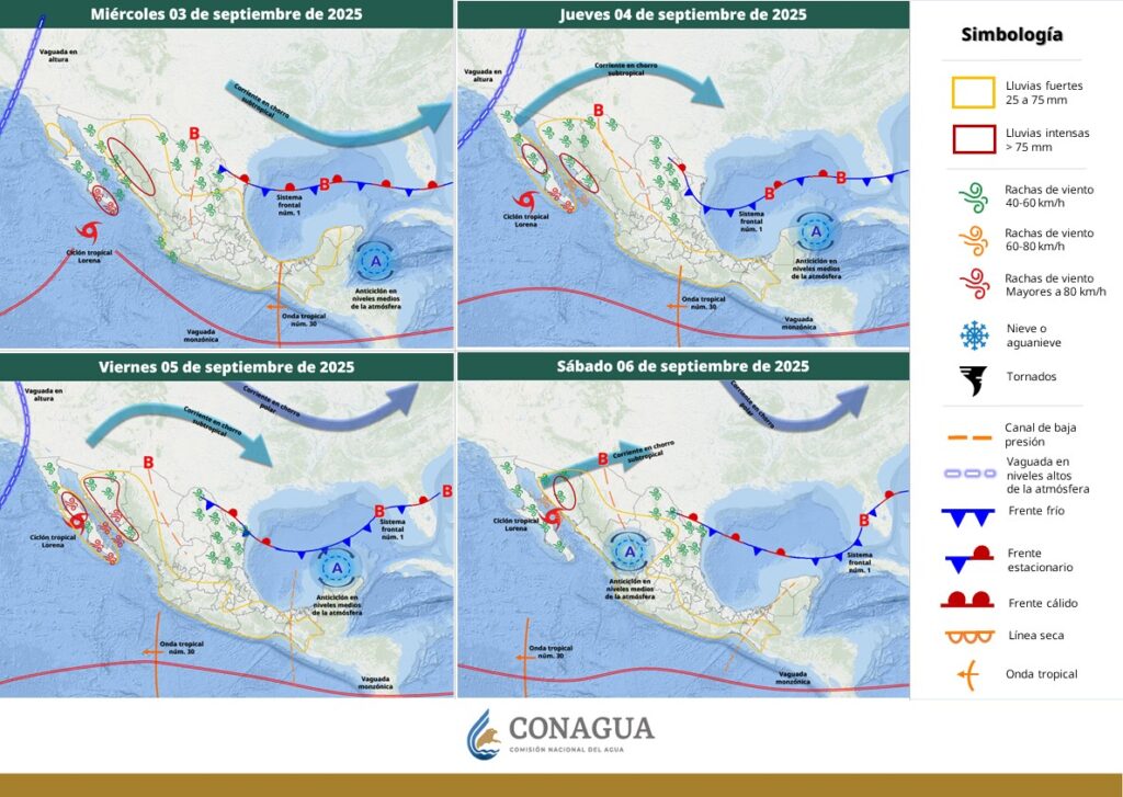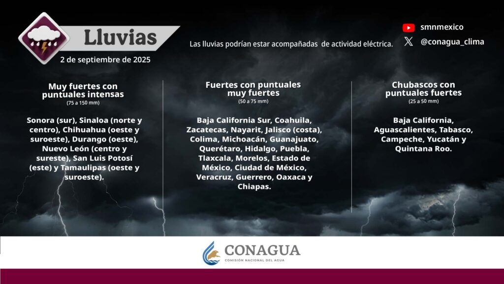 Pronostica lluvias muy fuertes con puntuales intensas (de 75 a 150 mm) en Baja California Sur (centro y sur), Sonora (centro y sureste), Chihuahua (oeste y suroeste), Durango (noroeste, oeste y suroeste) y Sinaloa.