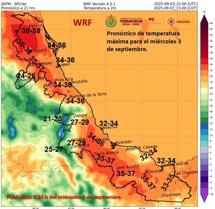 Las máximas de 35 a 40 °C en Baja California Sur, Chihuahua, Coahuila, Nuevo León, Tamaulipas, San Luis Potosí, Sinaloa, Oaxaca, Chiapas, Veracruz, Tabasco, Campeche, Quintana Roo y Yucatán.