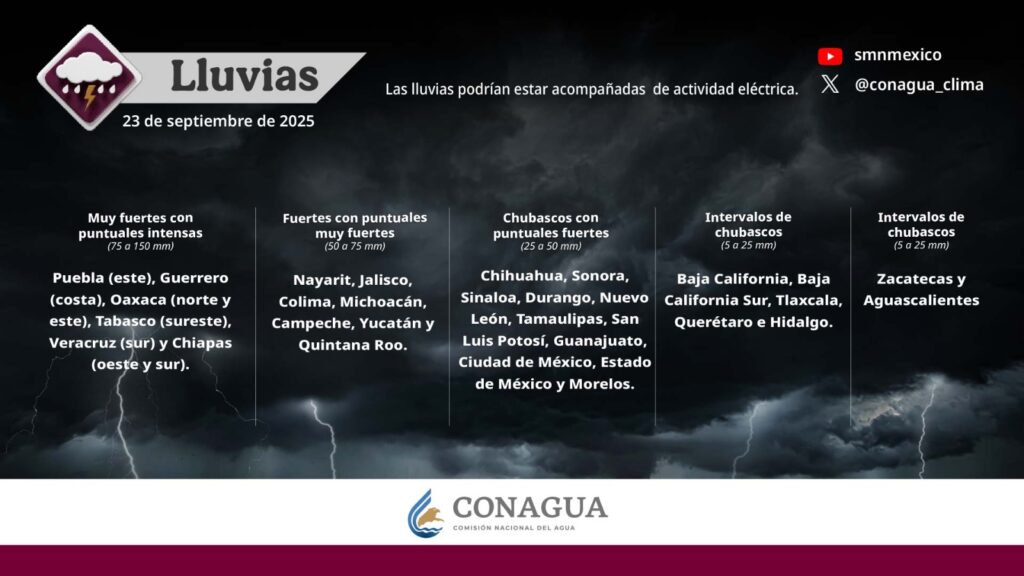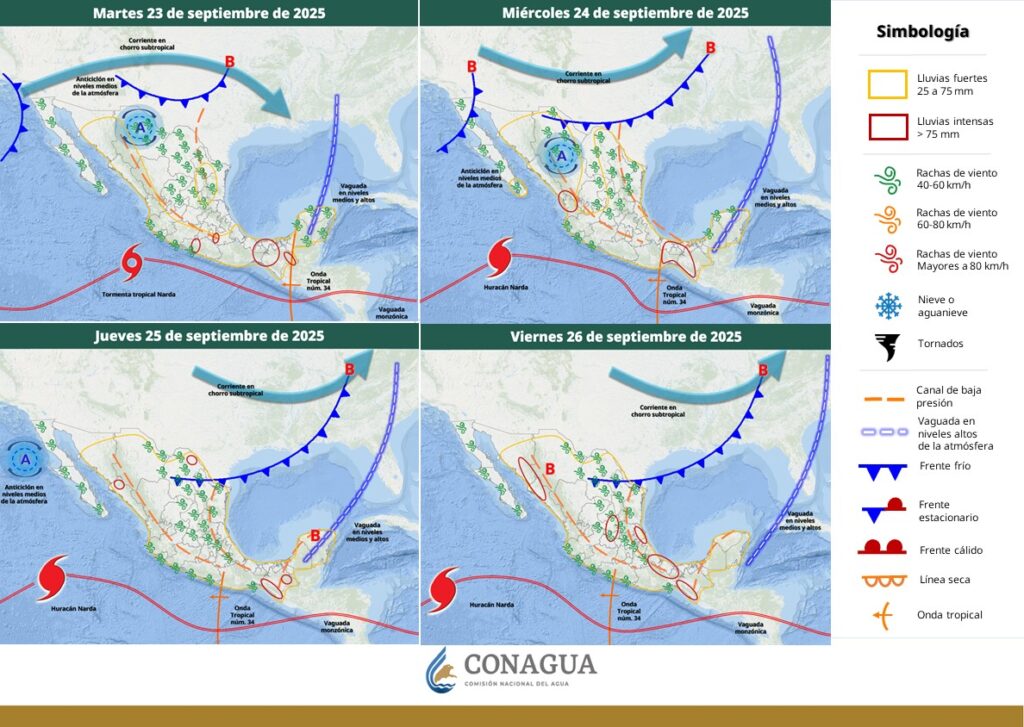 Pronostica lluvias muy fuertes con puntuales intensas (de 75 a 150 mm) en Puebla (este), Guerrero (costa), Oaxaca (norte y este), Tabasco (sureste), Veracruz (sur) y Chiapas (oeste y sur).