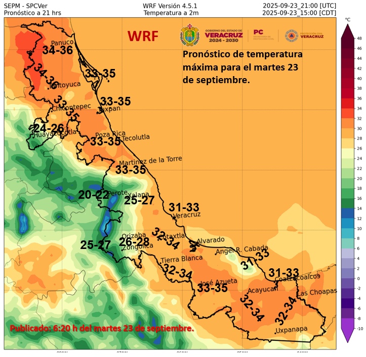 Las máximas de 30 a 35 °C en Nayarit, Colima, Guerrero, Chiapas, Zacatecas (sur), Guanajuato (noreste), Querétaro (norte), Hidalgo (norte), Puebla (norte), Veracruz y Tabasco.