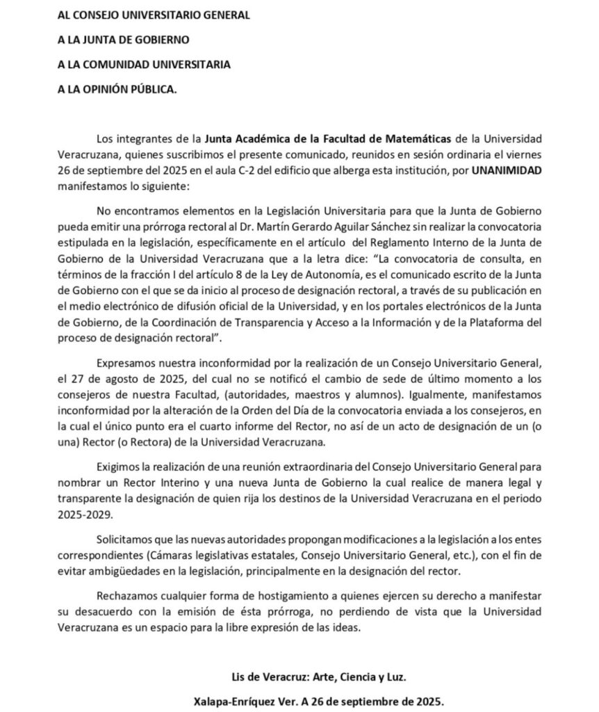 Un rector interino y una nueva Junta de Gobierno de la UV exige la junta académica de la Facultad de Matemáticas de la Universidad Veracruzana