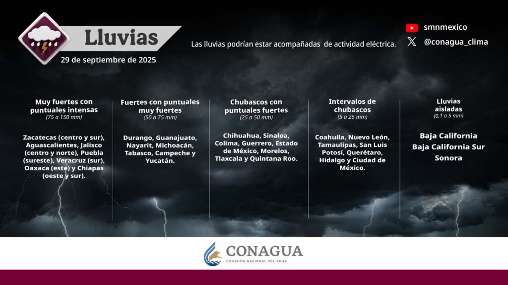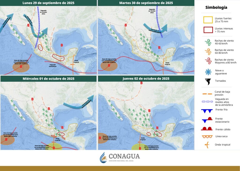 También, informa la CONAGUA, en la península de Yucatán, con lluvias puntuales intensas en Veracruz (sur), Oaxaca (este) y Chiapas (oeste y sur).