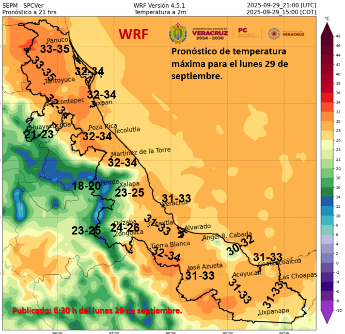 Las máximas de 30 a 35 °C en Chihuahua, Tamaulipas, San Luis Potosí (este), Hidalgo (norte), Puebla (norte y suroeste), Morelos, Nayarit, Guerrero, Chiapas, Veracruz, Tabasco, Campeche, Yucatán y Quintana Roo.