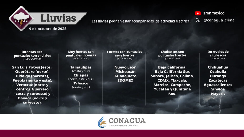 Pronostica lluvias intensas con puntuales torrenciales (de 150 a 250 mm) en San Luis Potosí (este), Querétaro (norte), Hidalgo (noreste), Puebla (norte y este), Veracruz (norte y centro), Guerrero (costa y suroeste) y Oaxaca (norte y suroeste).