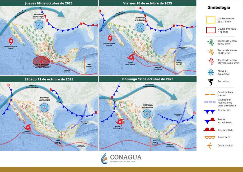 Este día, informa la CONAGUA, la tormenta tropical Priscilla continuará su desplazamiento paralelo a la costa occidental de Baja California Sur.