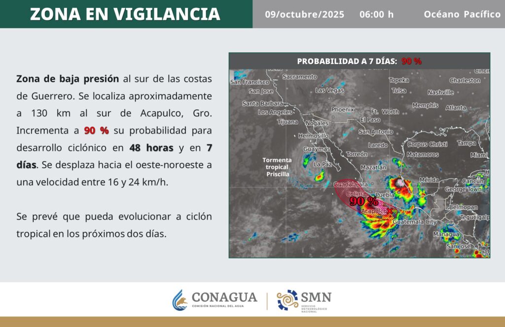 Por otra parte, apunta, una zona de baja presión con probabilidad para desarrollo ciclónico o posible ciclón tropical se localizará frente a las costas de Guerrero y Michoacán.