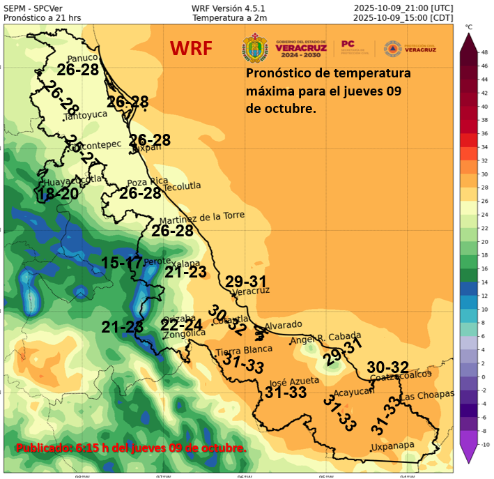 Cielo nublado durante el día con lluvias puntuales torrenciales en Veracruz (norte y centro); y puntuales intensas en Tamaulipas (costa y sur) y Tabasco (oeste y sur); dichas lluvias podrían acompañarse con descargas eléctricas, y originar el incremento en los niveles de ríos y arroyos, deslaves, inundaciones, encharcamientos y visibilidad reducida. Por la mañana, ambiente templado a cálido. Durante la tarde, ambiente cálido a caluroso. Viento del norte y noreste de 20 a 30 km/h con rachas de 40 a 50 km/h en costas de Tamaulipas, y rachas de hasta 40 km/h en Veracruz y Tabasco.