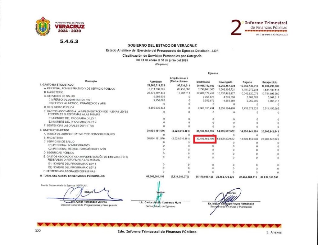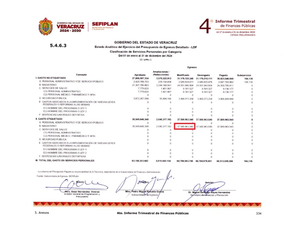 En 2024 el gobierno de Cuitláhuac García terminó destinando 37 mil 589 millones 963 mil pesos para «servicios personales» en el magisterio.