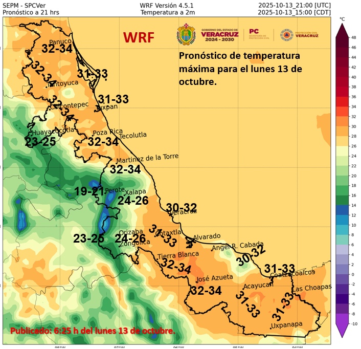 Cielo medio nublado a nublado durante el día con lluvias puntuales fuertes en Veracruz; las cuales estarán acompañadas con descargas eléctricas y fuertes rachas de viento; además, podrían reducir la visibilidad en tramos carreteros, originar encharcamientos, deslaves e inundaciones, y el incremento en los niveles de ríos y arroyos; chubascos en Tamaulipas y Tabasco. Por la mañana, ambiente fresco a templado con bancos de niebla en zonas serranas. Durante la tarde, ambiente cálido a caluroso. Viento de dirección de componente este de 15 a 25 km/h con rachas de 30 a 50 km/h en Tamaulipas.
