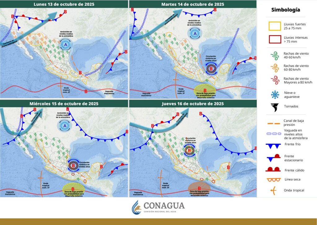 Lo anterior, junto con la onda tropical número 37 sobre Guerrero y otra vaguada en altura sobre la península de Yucatán, propiciarán chubascos y lluvias fuertes en las regiones mencionadas.