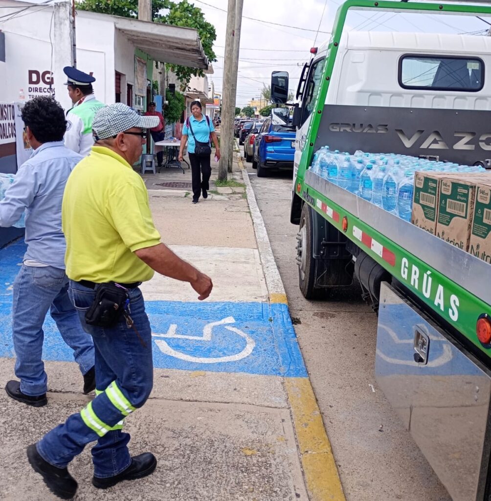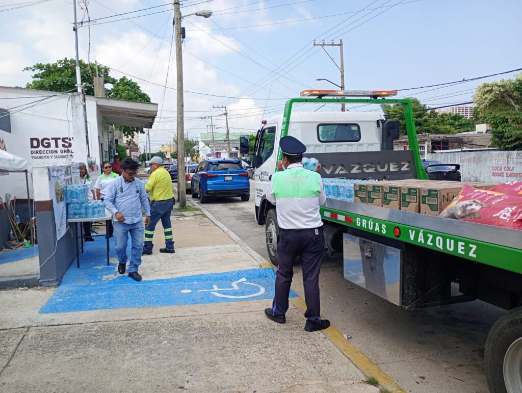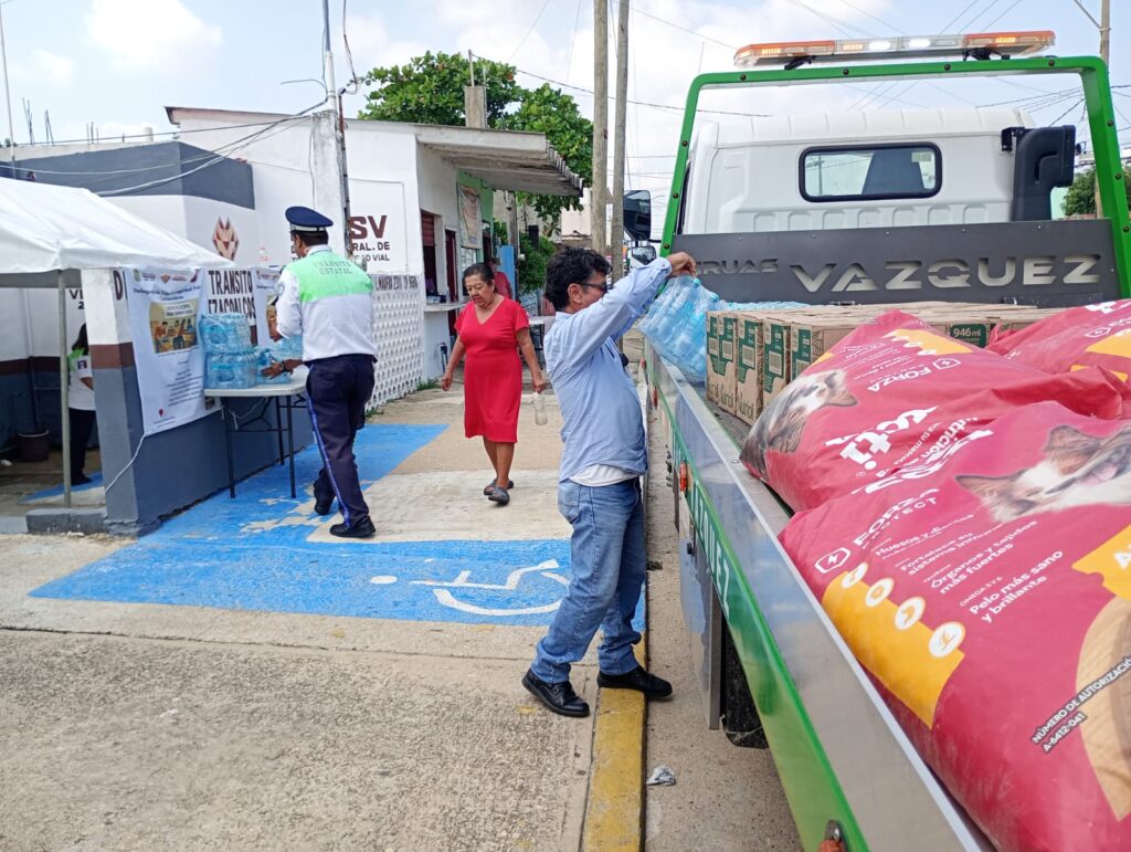 La Licenciada Rosario Jaimez Sol, en representación del Delegado de Tránsito, Alan Manuel Ibarra Oregon, recibió 10 cajas de aceite Nutrioli, 15 planchas de agua y 8 bultos de 20 KG de alimento para perro.