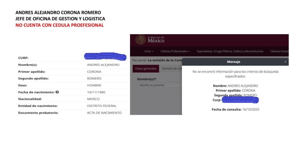 Andrés Alejandro Corona Romero, jefe de Oficina de Gestión y Logística, igualmente no tiene cédula profesional, ni se le conocen antecedentes laborales cercanos a este tipo de función.