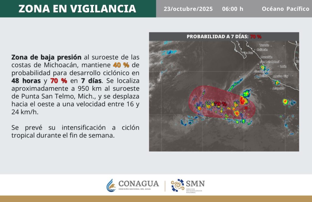 Así mismo, añade, canales de baja presión en el interior del país originarán lluvias aisladas y chubascos dispersos en estados del norte, occidente y centro, además de lluvias puntuales fuertes en Michoacán.