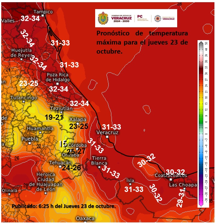 Las máximas de 30 a 35 °C: Chihuahua (suroeste), Durango (noroeste), Michoacán, Guerrero, San Luis Potosí, Puebla (suroeste), Veracruz, Oaxaca, Chiapas, Tabasco y Quintana Roo.