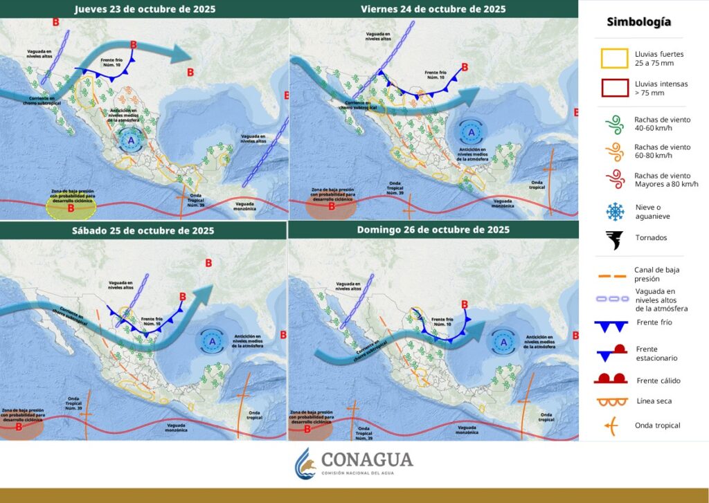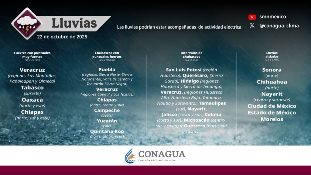 Pronostica chubascos con lluvias puntuales fuertes (de 25 a 50 mm) en Chihuahua (oeste), Michoacán (centro, oeste y sur), Veracruz (región Olmeca), Tabasco (oeste y sur), Oaxaca (noreste), Chiapas (norte, este y sur) y Quintana Roo (sur).