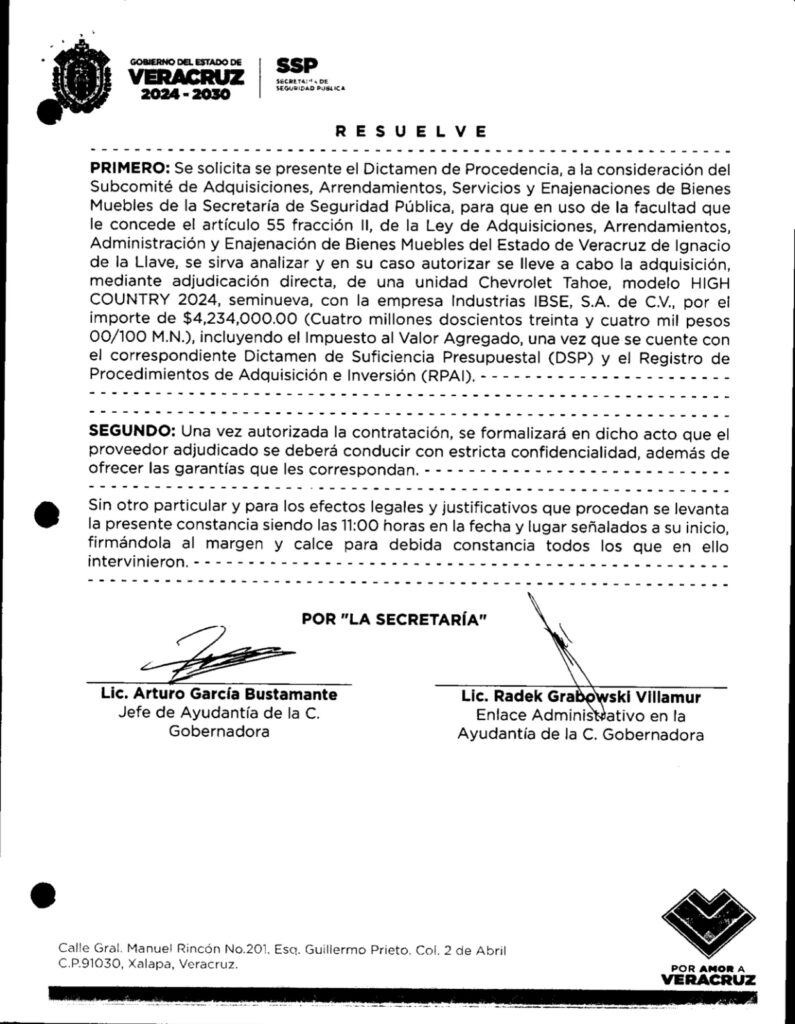 La SSP determinó el 29 de abril de 2025, adquirir una camioneta Chevrolet Tahoe modelo High Country 2024, específicamente, para uso de la gobernadora, por la cantidad de 4 millones 234 mil pesos.