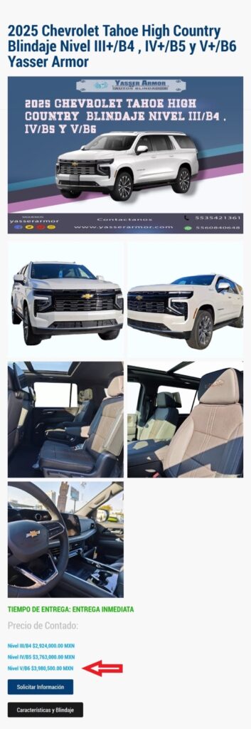 Sin embargo, la misma camioneta 2025 que se oferta con blindaje de altas especificaciones, se anota que está para “entrega inmediata”.