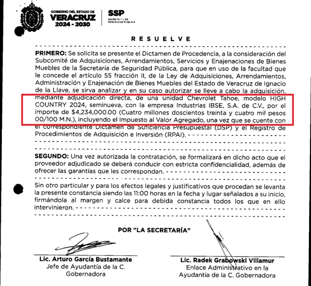 La Secretaría de Seguridad Pública (SSP) de Veracruz compró una camioneta “seminueva”, módelo 2024, “de alta seguridad” para uso de la gobernadora Rocío Nahle, porque su seguridad “constituye una prioridad fundamental”, por adquisición directa, pero la misma tiene un precio superior a un vehículo nuevo, modelo de éste año y con características similares.