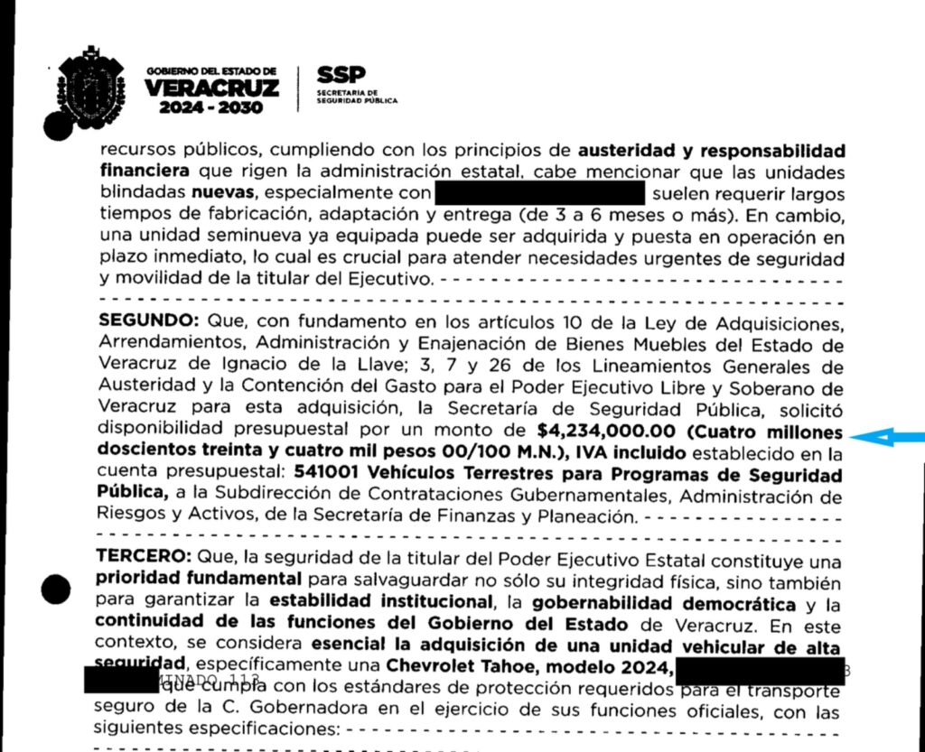 En ese documento, avalado por Arturo García Bustamante, jefe del Área de Ayudantía de la C. Gobernadora, y Radel Grabowski Villamur, delegado administrativos en el Área de Ayudantía de la C. Gobernadora, se enfatiza que la adquisición inmediata del vehículo blindado con altas especificaciones, “es crucial para atender necesidades urgentes de seguridad y movilidad de la titular del Ejecutivo”.
