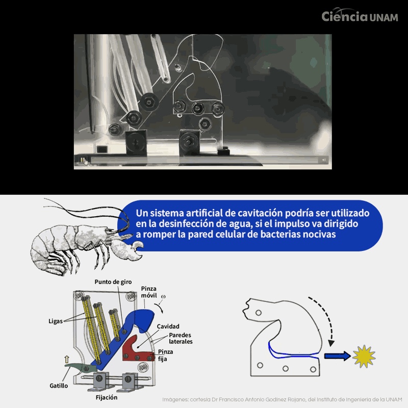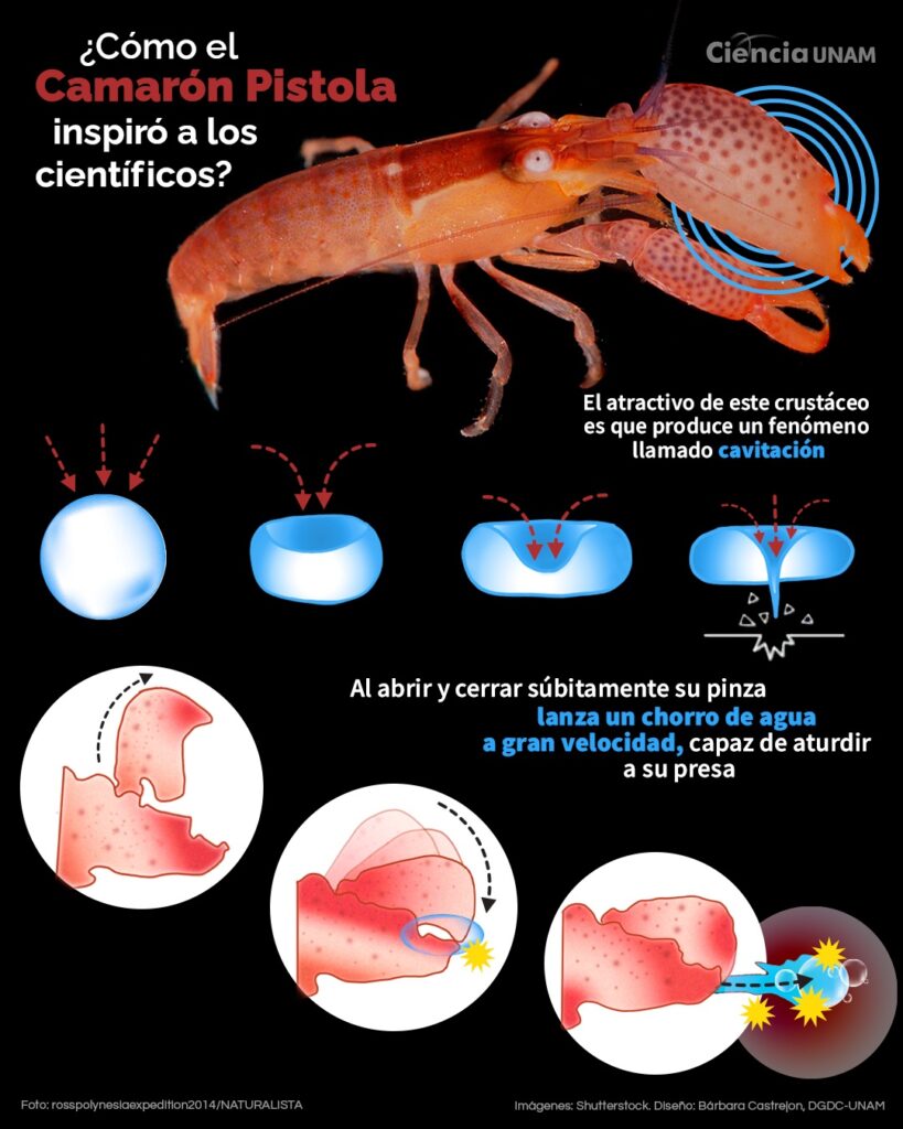 Para el camarón esto es parte de su comportamiento y sobrevivencia, sin saber que en ese rápido movimiento está generando cavitación, es decir, ese mecanismo que permite que se formen burbujas dentro del agua, que llevan gas en su interior y que colapsan abruptamente.