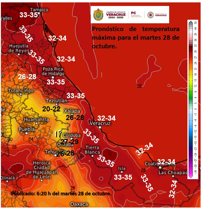 En el trascurso del día, cielo medio nublado a nublado. Por la mañana, ambiente cálido, siendo templado a fresco en sierras de la región, y frío en la zona montañosa de Veracruz. Durante la tarde, ambiente cálido a caluroso, con temperaturas máximas mayores a 35 °C en zonas de Tamaulipas; intervalos de chubascos en Tamaulipas, Veracruz (regiones Huasteca Alta, Huasteca Baja y Totonaca) y Tabasco; así como lluvias aisladas en Veracruz (regiones Los Tuxtlas y Olmeca). Viento de componente este en la mayor parte de la región, siendo de 35 a 50 km/h con rachas de 65 a 80 km/h en Tamaulipas; y de 10 a 20 km/h con rachas de 35 a 50 km/h en Veracruz y Tabasco. A partir de la madrugada de miércoles, se pronostica evento de “Norte” con viento de 65 a 75 km/h y rachas de 85 a 100 km/h y oleaje de 2.0 a 3.0 metros de altura en la costa norte de Tamaulipas.