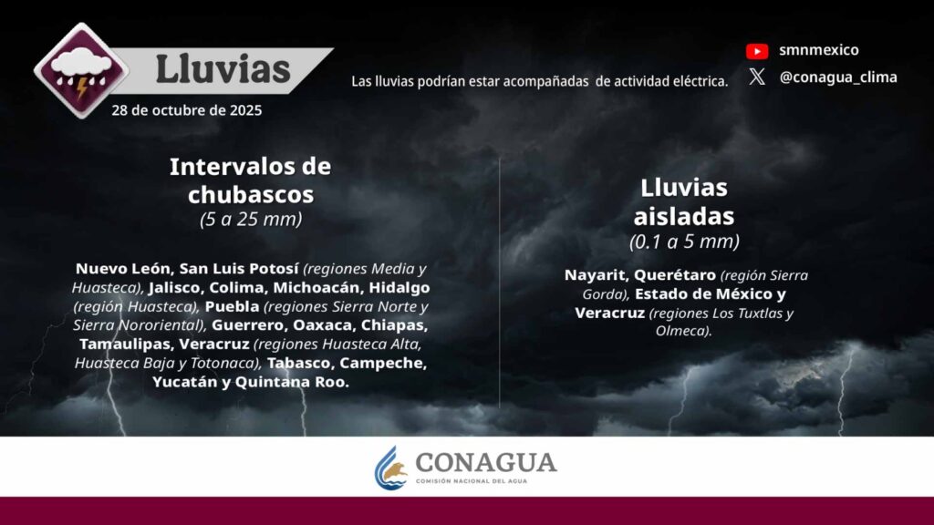 Pronostica intervalos de chubascos (de 5 a 25 mm) en Nuevo León, San Luis Potosí (regiones Media y Huasteca), Jalisco, Colima, Michoacán y Hidalgo (región Huasteca).