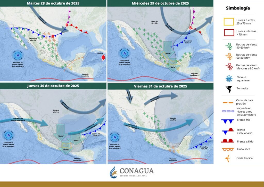 Lo anterior, informa la CONAGUA, originará chubascos en Nuevo León y Tamaulipas, y vientos con rachas muy fuertes de 65 a 80 km/h en los estados fronterizos del noreste de México.