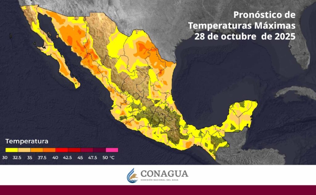 Las temperaturas máximas irán de 35 a 40 °C en Baja California Sur, Sonora, Sinaloa, Chihuahua (suroeste), Coahuila (este), Nuevo León (norte y centro), Durango (oeste), San Luis Potosí, Tamaulipas, Nayarit, Jalisco, Colima, Michoacán, Guerrero y Oaxaca.
