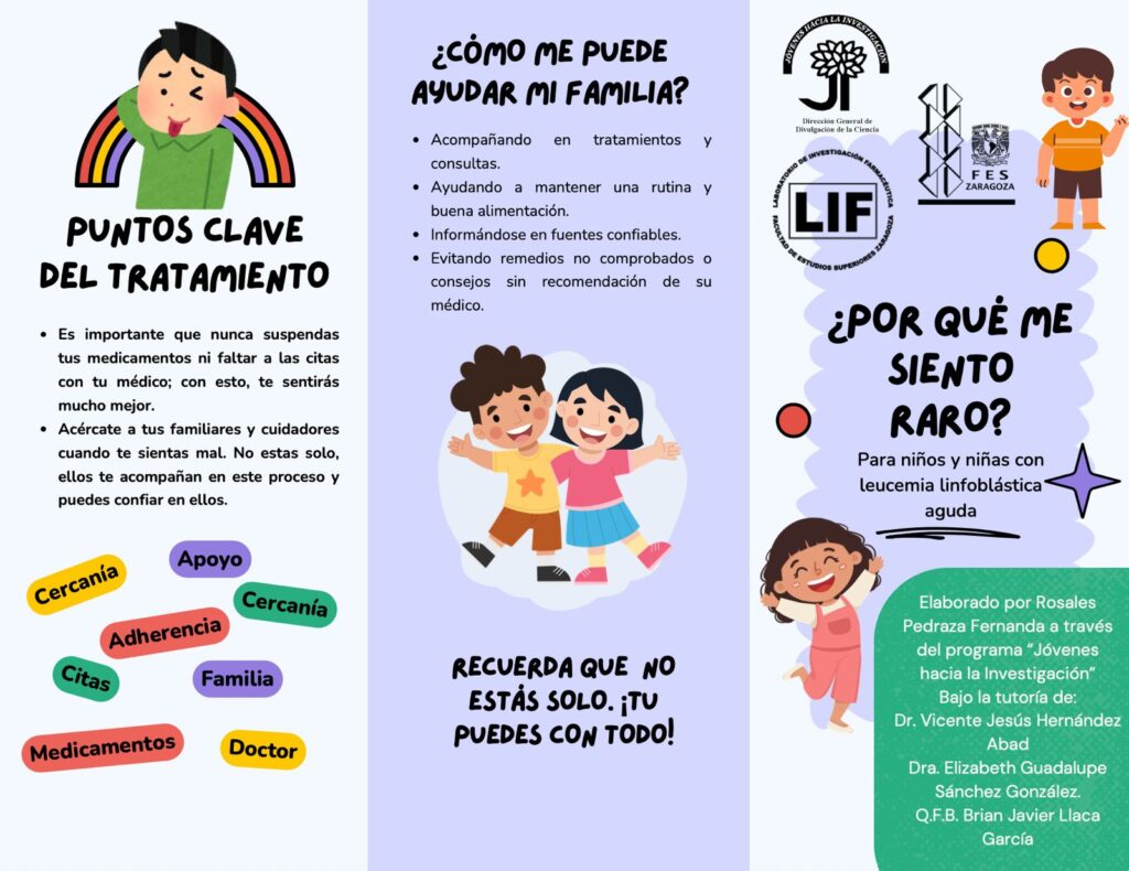 “Fue muy grato ayudarla y estoy sorprendido con la facilidad que tuvo para manejar la terminología médica. Actualmente vivimos en una sociedad en la que podemos obtener información de diferentes fuentes que muchas veces no son confiables. Entonces, todo lo que viene en los folletos, pero especialmente en éste, tiene un aval. Es información muy simplificada que va a ayudar a generar estrategias para mantener un control y mejorar los tratamientos hacia los pacientes pediátricos, con el fin de que tengan calidad de vida durante esta etapa”, explicó Brian Javier Llaca García, químico de la FES Zaragoza.
