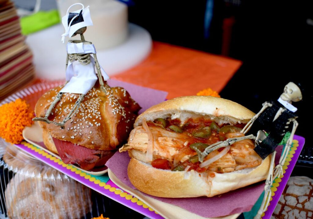 También, los de birria, cochinita pibil, guajolota con pan de muerto; pipián, elote, huastecos y zacahuil; además se ofrecen de camarón, pulpo, mantarraya, verduras y distintas variedades de pan de muerto y bebidas tradicionales.