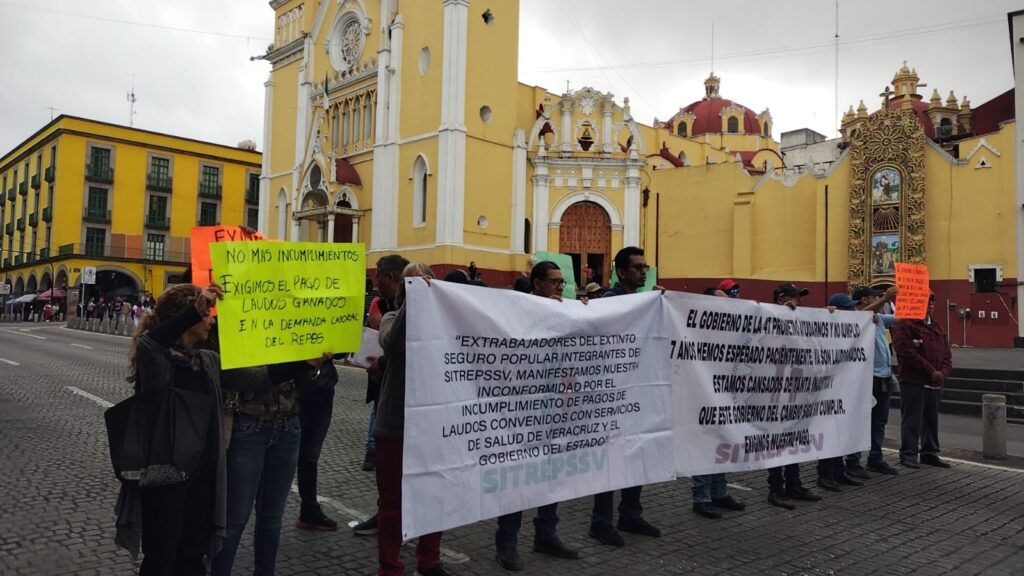 Ex trabajadores del desaparecido Seguro Popular, se manifestaron en la Plaza Sebastián Lerdo de Tejada y bloquearon la avenida Juan de la Luz Enríquez, para exigir al gobierno del estado el pago de sus laudos laborales ganados, luego de los acuerdos sostenidos hace tres meses con funcionarios de la Dirección General de Política Regional y de la Secretaría de Gobierno.